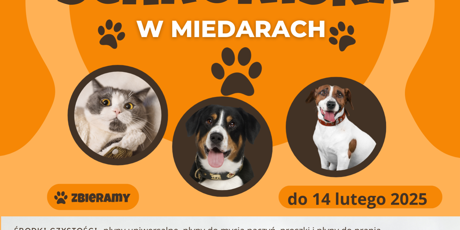 Gorąco zachęcamy do wsparcia zwierzaków ze Schroniska dla bezdomnych zwierząt w Miedarach. Do 14 lutego trwa w szkole zbiórka karmy suchej dla psów, mokrej karmy dla kociąt, misek, wiader na wodę, koców oraz środków czystości. Nie bądźmy obojętni i pomóżmy naszym małym przyjaciołom!